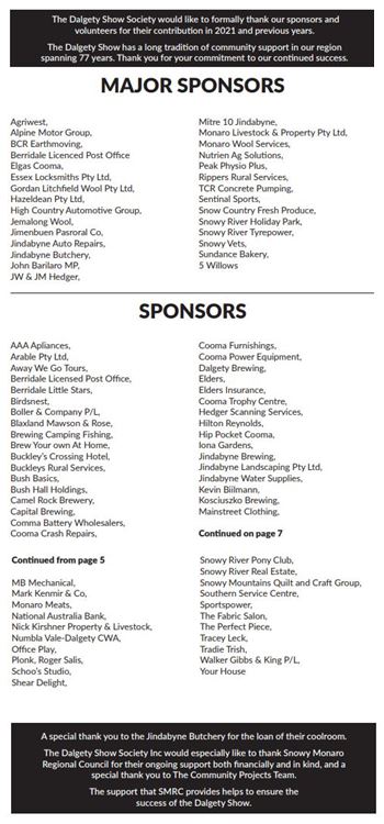 Without our sponsors, the show would not go on. To all our sponsors, the show committee says a big ‘thank you’. The response from local businesses is always cheerful and generous and the Dalgety Show Society appreciates our sponsors’ help very much.